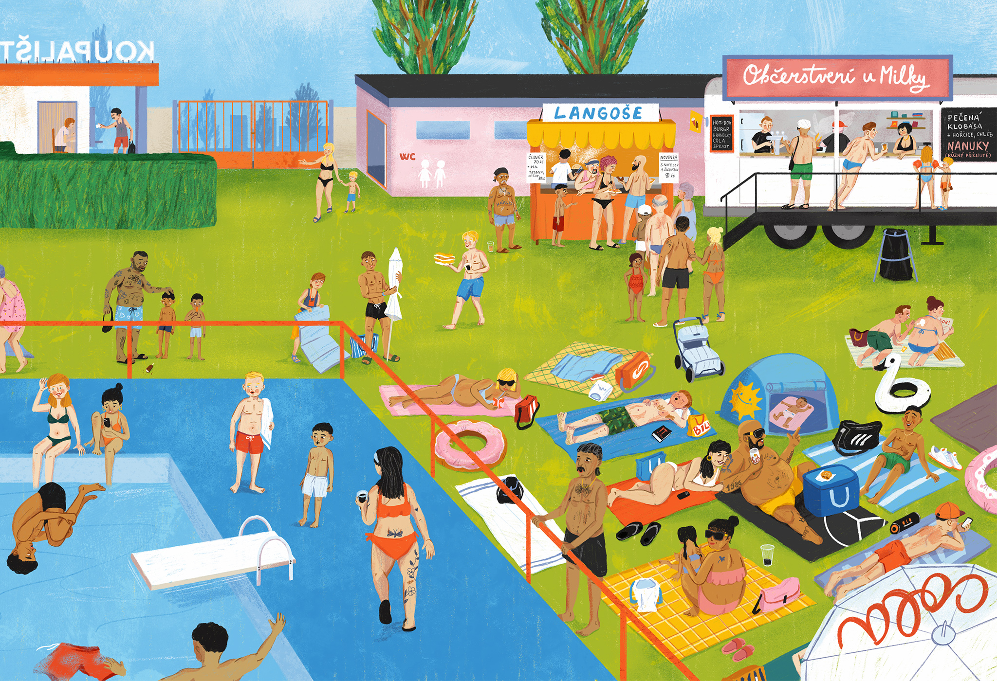 Kúpalisko - ilustrácia z knihy Jekh, Duj, Trin! - Kher, 2024